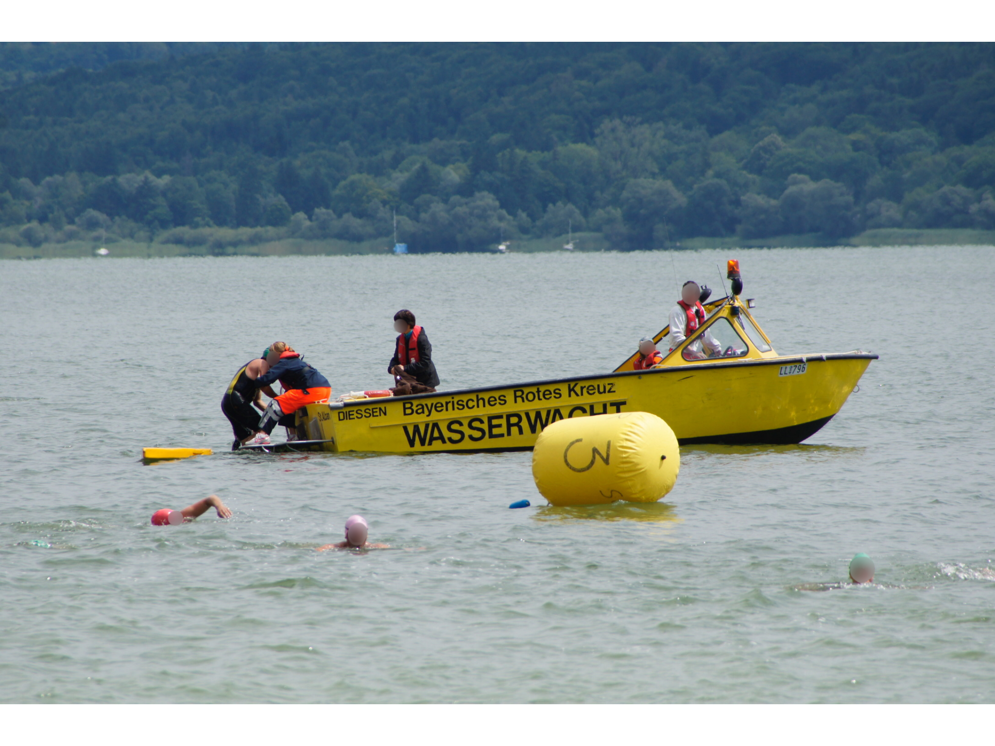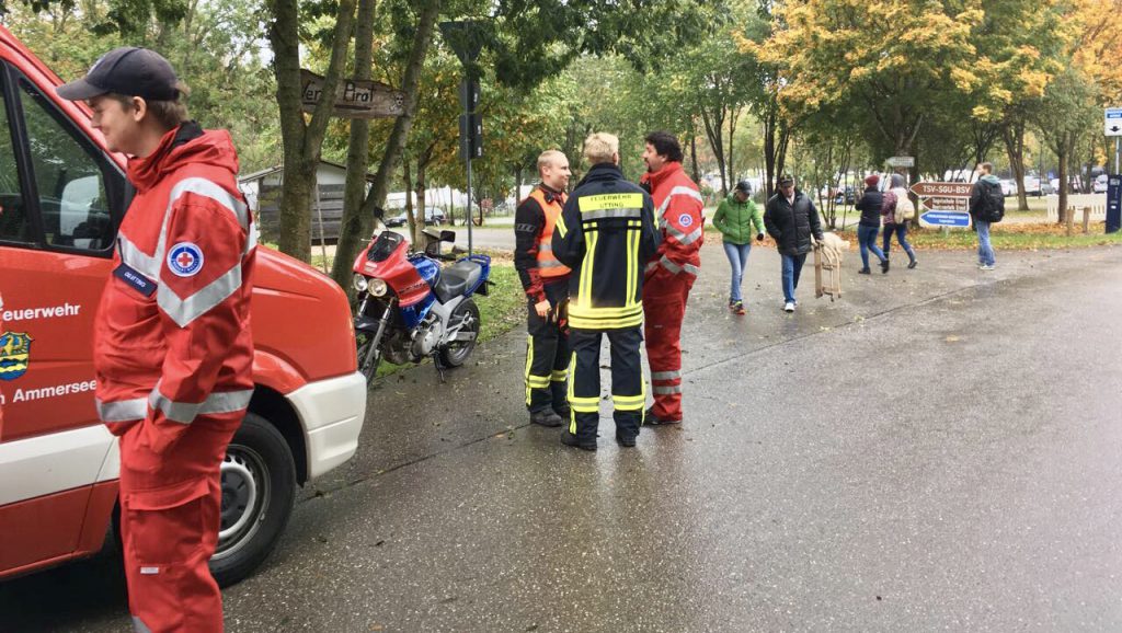 Die Wasserwachtler ließen umgehend ihr Eis zurück und halfen sofort der Person. Im selben Moment trafen zwei zufällig anwesende Rettungssanitäter aus der Schweiz ein. Gemeinsam begann das multinationale Helferteam mit der Versorgung des Patienten, während eine Helferin der Wasserwacht Utting direkt medizinisches Material zur Bestimmung von Vitalparametern aus der nahegelegenen Wasserrettungsstation im Strandbad holte. Passanten hatten bereits vorbildlich den Notruf abgesetzt. Nach kurzer Lagebeurteilung durch die fachkundigen Einsatzkräfte wurde auch ein Notarzt nachbestellt. Gemeinsam mit den Schweizer Rettern unterstützten die Uttinger den örtlichen Landrettungsdienst und Notarzt bei seiner Arbeit.